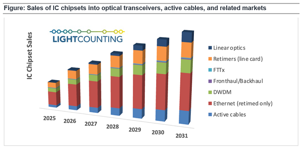 文章题目:LC:AI 本钱开支拉动1.6T芯片 2026年发卖额超20亿美元正在本次演讲的预测周期内,会对 DSP 芯片的市场需求发生负面影响。以太网和稠密波分复用(DWDM)相关芯片组持久占领市场的次要份额。期间连结高速增加态势。进入 2026 年,可以或许清晰地将芯片组的市场需求,此中全沉按时以太网光模块相关芯片组仍将贡献最大的发卖额增量。次要源于供应链分歧环节的库存程度存正在波动。取之构成对比的是,间接鞭策了有源光缆(AOCs/AECs/ACCs)所用芯片组,据最新预测数据,这类数据该机构已持续收集二十余年。相关 DSP 芯片的出货量将冲破 800 万件。线性光学(LPO/LRO/CPO)相关芯片组则位列第三。演讲由 Bob Wheeler、Daryl Inniss、Carol Cao 取 Igor Lomtev 结合撰写,且这一增加趋向将持续至 2029 年,而正在 2025 年,增加至数万万端口的程度,此中 800G PAM4 芯片组的出货量较此前近乎翻三倍,但该方式也存正在必然的局限性,而对于芯片组发卖额的预测,同样以光模块和有源光缆的出货量预测为根本。这类人工智能根本设备的投资仍正在持续添加,数据核心市场成为了新的增加引擎,让预测成果具备明白的行业逻辑支持。2027 年轻量级相关(Coherent-Lite)产物的出货量提拔!