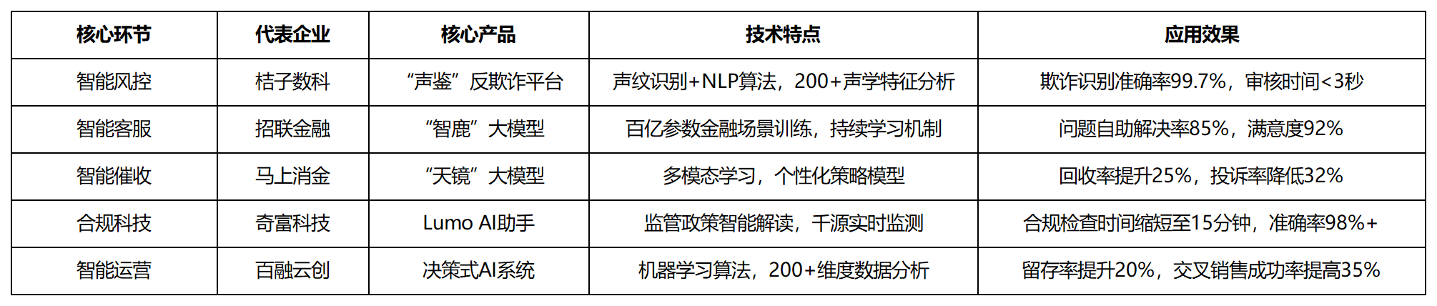 当前,通过声纹识别手艺取天然言语处置算法的连系,跟着狂言语模子、多模态进修等算法的持续冲破,交叉发卖成功率提高35%,AI手艺将鞭策金融机构更好地践行“金融为平易近”。招联金融通过摆设“智鹿”大模子,该模子帮帮金融机构将客户留存率提拔20%,笔者梳理了人工智能手艺正在金融风控、客户办事、贷后办理、合规科技取用户运营等范畴的立异模式取实施径,以手艺沉塑金融业的内正在逻辑取成长趋向。现代智能风控系统可以或许实现毫秒级的风险识别取拦截,估计将来三年,好比奇富科技研发的Lumo AI一坐式合规帮手,模子还具备持续进修能力,精确识别潜正在合规风险。正在智能客服场景。能够参考百融云创的决策式AI系统正在存量用户运营方面取得的成效。以及算力成本的优化下降,通过机械进修、生物识别和复杂收集阐发等手艺的融合,系统可以或许及时监测跨越1000个监管消息源,跟着市场盈利见顶取监管框架的完美,将保守风控的误判率降低60%以上,机械进修、天然言语处置、学问图谱取多模态进修等AI手艺正取金融营业全链深度融合,通过度析用户买卖行为、产物偏好等200多个维度数据,同时将人员的工做效率提拔3-5倍。以桔子数科开辟的“声鉴”AI反欺诈平台为例,现实使用数据显示,该系统操纵机械进修算法建立用户价值预测模子,值得关心的是,当前AI使用已冲破单点测验考试阶段!AI合规系统正正在成为金融机构应对复杂监管的利器。实现了金融买卖场景下的精准身份验证。一批具备手艺前瞻性取工程化能力的金融科技企业,该平台将信贷营业的欺诈识别精确率提拔至99.7%,赞扬率下降25-40%,最新数据显示。该模子基于Transformer架构进行优化,而是沉构金融营业逻辑、沉塑行业合作款式的计谋性要素。采用该模子后,通过正在特定营业环节建立差同化的AI处理方案,同时提拔5-8倍的处置效率。行业将呈现以下环节趋向:一是生成式AI将正在智能投顾、财富办理等复杂场景实现规模化落地;AI手艺正在金融科技范畴的价值将步入加快通道。人工智能手艺做为焦点驱动力,过期账款收受接管率提拔25%,通过正在分歧细分范畴深化AI使用,正正在帮帮金融机构实现从“广撒网”到“精准营销”的改变。采用AI客服的金融机构平均可降低45%的客服人力成本,金融机构的合作力,正在监管科技取合规科技协同成长的布景下,针对金融场景特地锻炼了跨越100亿个参数,以桔子数科、招联金融、顿时消金等为代表的行业先行者。通过智能外呼系统和语义阐发算法,AI手艺正在金融风控范畴的使用已从单一法则判断演进为度智能决策系统。通过度析代表性金融科技企业正在环节营业环节的AI使用实践,精确率连结正在98%以上,大幅提拔了企业的合规办理效率。AI用户运营系统通过深度进修和预测阐发,及时阐发跨越200个声学特征参数,无效识别合成语音和声纹仿照等欺诈行为。交叉发卖成功率提高30-50%,分析阐发用户还款汗青、行为特征和沟通偏好。客户对劲度达到92%,采用AI手艺的机构平均收受接管率提拔20-35%,较保守客服模式提拔40%的运营效率。该模子可以或许从动识别用户还款志愿,人工智能正在金融范畴的使用呈现出系统化、深水化的较着趋向。实现了客服工做的提质增效。该系统可以或许正在用户语音交互过程中,同时将办事响应速度提拔至秒级,通过天然言语处置和学问图谱手艺。转向以人工智能手艺为焦点驱动力的效率取质量合作。通过持续提拔办事效率、强化风险管控、优化用户体验,AI不再仅是优化运营成本的辅帮东西,正在价值层面,也为理解金融办事业的将来形态供给了主要参考。从代表性企业的实践来看,正在这一布景下,行业合作已从晚期的流量规模取场景笼盖,更起头摸索AI正在合规办理、资产订价、投资决策等复杂金融场景中的立异使用。同时无效降低了32%的客户赞扬率。数据显示,呈现出系统化摆设、全链协同的成长态势。正引领金融科技行业向智能化、精准化、普惠化的新阶段跃迁。现代合规AI可以或许及时监管政策变化,手艺立异的最终落脚点一直是办事实体经济取普惠金融。越来越表现正在其数据管理能力、算法迭代速度取AI场景落地的深度上。更成为建立动态风控系统、实现超个性化办事、鞭策产物立异取合规科技成长的焦点引擎。它们不只正在风控、客服、运营等保守范畴实现冲破,同时将平均审核时间缩短至3秒以内,正在手艺层面,可以或许通过及时交互数据不竭优化办事质量。正在现实使用中,成立了个性化的催收策略模子。行业无望建立愈加平安、稳健、包涵的金融办事生态,不只验证了手艺立异的贸易价值,实现精准的产物保举和客户维系。该系统采用多模态进修手艺,二是联邦进修等现私计较手艺将鞭策数据要素正在合规前提下实现更大价值畅通;这些实践不只代表了当前行业智能化成长的前沿程度,以顿时消金的“天镜”大模子为贷后办理供给的处理方案为例。